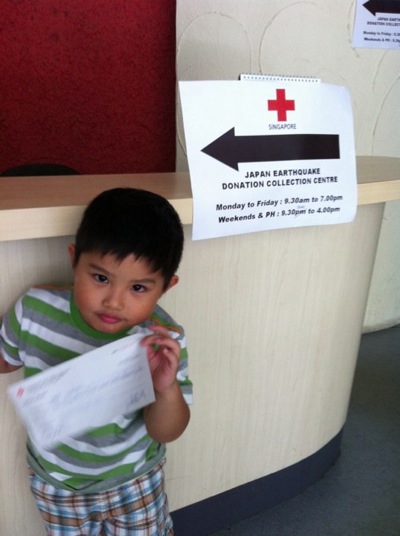 For a couple of days, Jay Jay has been bugging us to bring him to Red Cross so that he can donate his piggy bank money to help the Japanese. Jay loves to go Japan, and sit on the Shinkansen, and loves to eat the food there. When he learned about the earthquake he is concern. And ask a lot of questions about why, how, etc.