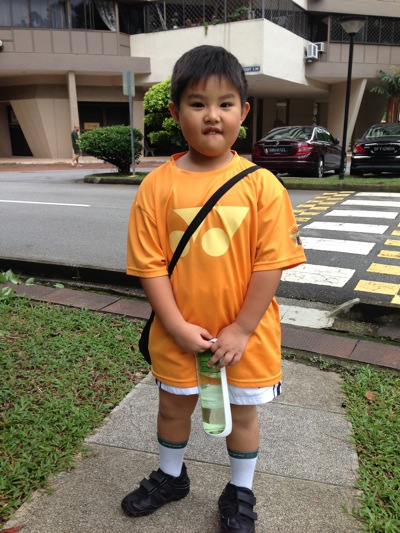 Today is Saturday. So, Jay Jay has his usual badminton lesson from Singapore Badminton School at Nan Hua Primary School. I have changed his timing to 11am. Where there are fewer students in this time slot. I think the student to coach ratio is very important. Today, we have 4 coaches teaching the kids. This is Jay Jay new badminton outfit and pants.