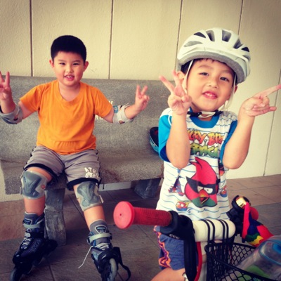 It’s a lovely afternoon. We decided to go downstairs to do inline skating and cycling after Jay Jay finished all his homework.