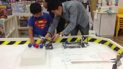 Jay build a robot arm, that the fixed claw will stop the ball at the right time, and grab the ball by closing the 2nd claw. And by controlling the NXT buttons, it can then lift up the ball and make a turn and release the ball on the box.