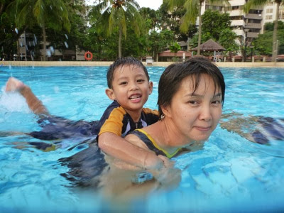 I think, this week, we going to bring him down more often so that he can sense that swimming is very fun, and he will enjoy the swimming lesson every Saturday.