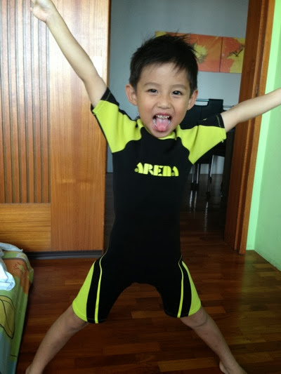 This week, mommy got him a new swim wear. This is a very thick swim wear. Feels like those diving shirt. And Kay Kay loves it so much. Why? 1) it helps to float a little. 2) it keeps him warm. I think when he a bit scare, he will feel cold. And when the breeze comes, he will shake.