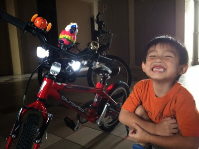 Kay Kay have three bell on his bike. The basketball bell, the Bird horn and the normal bell.