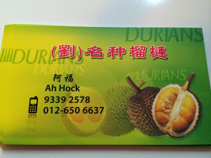 Here is Ah Hock’s name card again. Now, he has to rush to deliver the remaining durians to a Durian party.