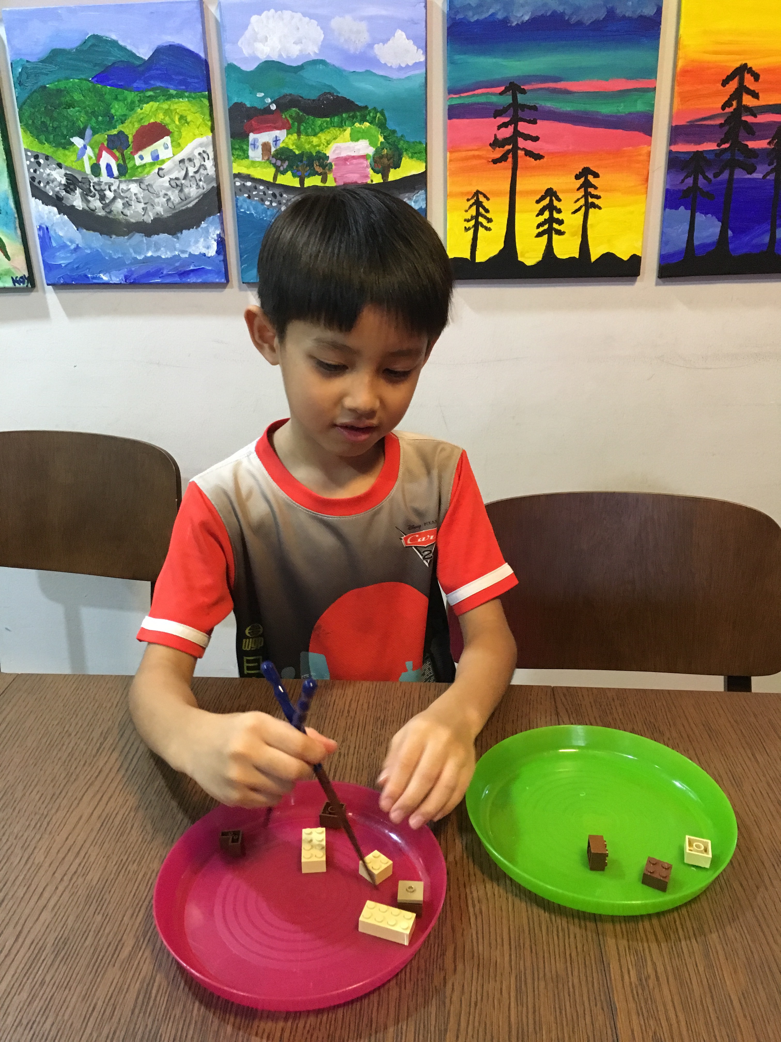Place a few Lego bricks in one plate. For beginner, use the chopsticks and poke it into the holes of a Lego brick. Then, squeeze your fingers to grab it firm. Easy right?