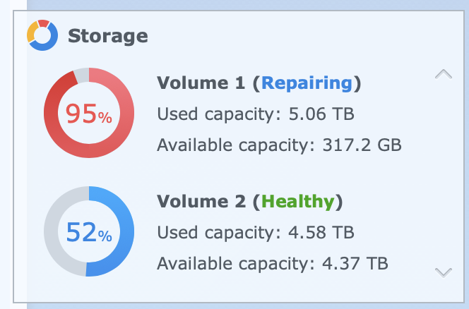 Upgrading the NAS is very easy. You need to upgrade one disk by one disk. So, while the NAS is running, you unplug one disk (old 6TB) out from the Synology NAS and you plug in a new hard disk, i.e. 9TB (yes, hot swap. ). Yeap, no need to shut down the NAS. Just do it while the power is on. Then, the NAS will complaint and says that your storage volume is degrading. Once you plug in the new hard disk, the lights turn on. All you need to do is configure your storage by “Repairing” it.