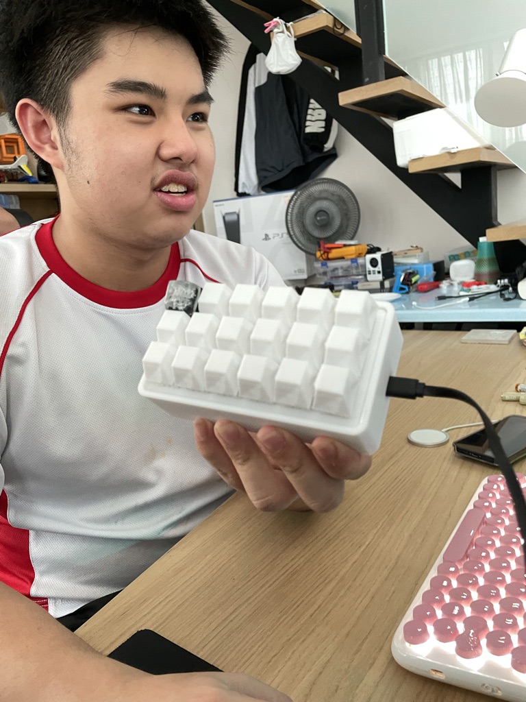 Can you guess what is this? He has spent 1-2 weeks designing this. From 6-keys now expanded to 18-keys. He has 3D printed multiple prototypes. And he dismantled a used keyboard and grab all the mechanical and electrical parts, using microcontroller to make this.